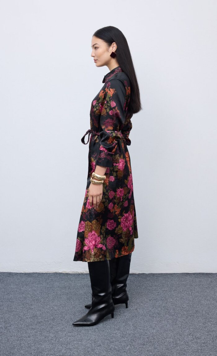 Πουκαμισοφόρεμα με γιακά, μακριά μανίκια με μανσέτες, αποσπώμενη ζώνη. Κλείσιμο με κουμπιά μπροστά.