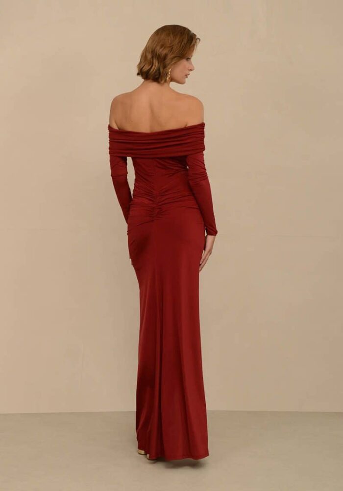 Μακρύ φόρεμα χωρίς ώμους με μανίκια από ελαστικό ζέρσει ύφασμα. Σούρα στην μέση και άνοιγμα μπροστά. Φερμουάρ στο πίσω μέρος.